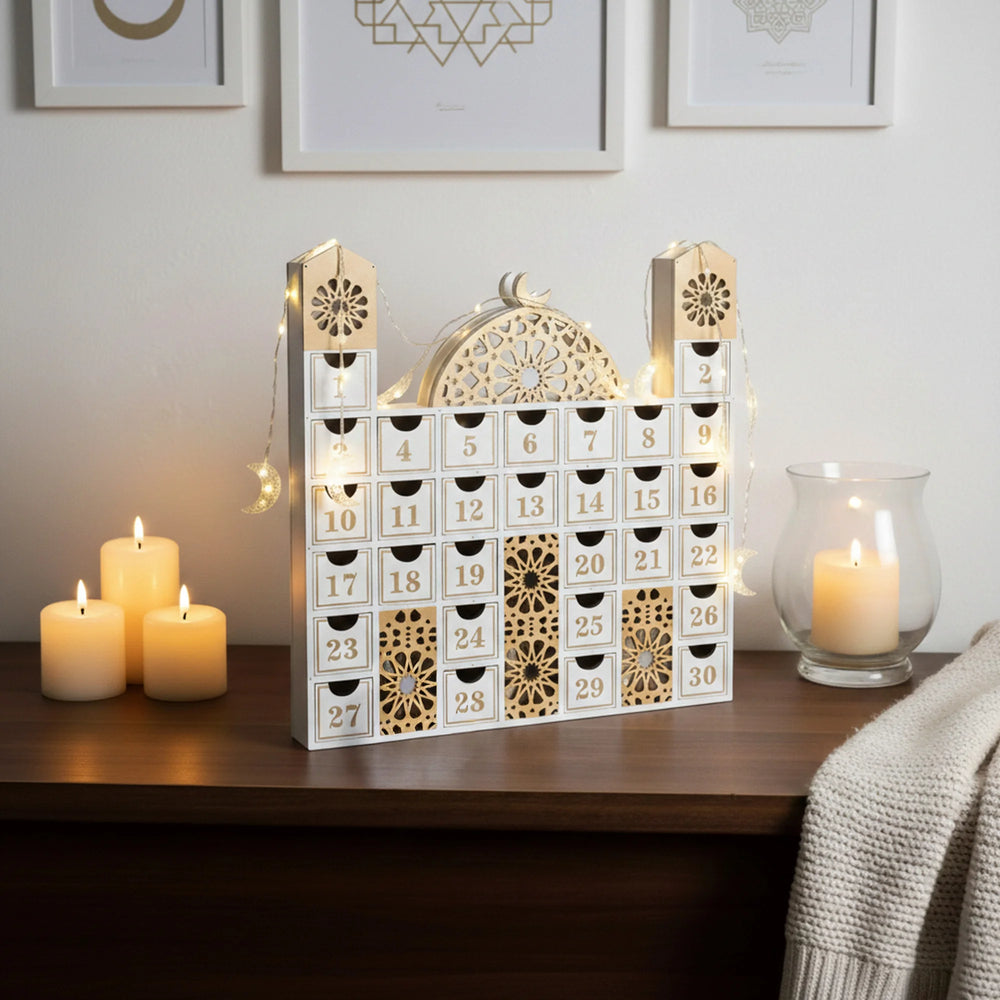 Crafted from durable density board and finished in classic neutral tones, it blends effortlessly into modern or traditional interiors. Perfect for children and adults alike, this calendar encourages reflection, gratitude, and joy throughout Ramadan.