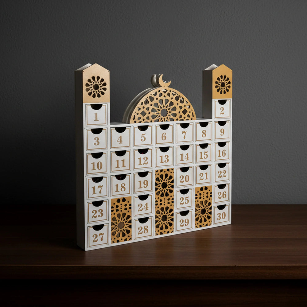 Shaped like a Masjid, this wooden countdown cabinet features small compartments that can be filled with treats, notes, or reminders, making each day feel special.